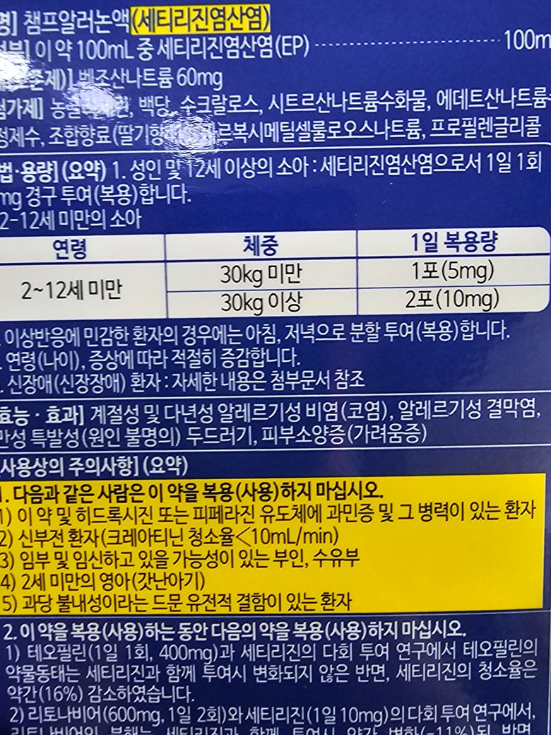 세티리진 성분은 나눠서 복용하는 것 보다 한 번에 치료용량을 복용하는 것이 효과가 좋으므로, 1회에 5mg 용량을 복용하는 것을 권장합니다.