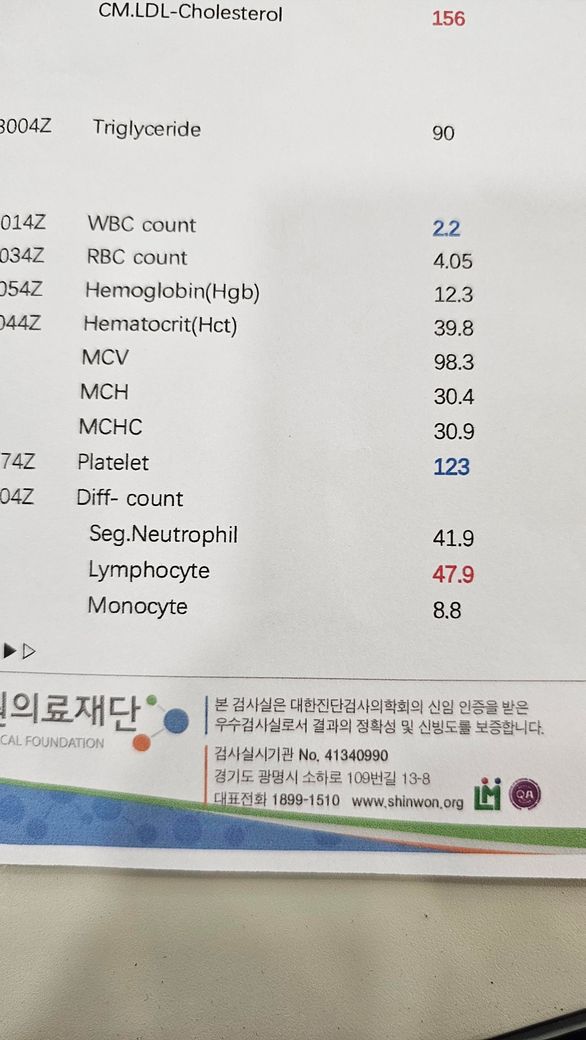 염증 후 일시적인 감소의 가능성도 있겠으나 1~2개월 후 추적검사에서 지속되거나 악화 시 혈액내과 진료를 받기 바랍니다.