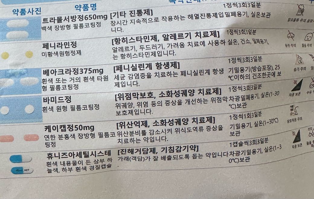 케이캡정50mg(위산분비억제제), 휴니즈아세틸시스테인(거담제), 베아크라정375mg(페니실린계 항생제)은 약