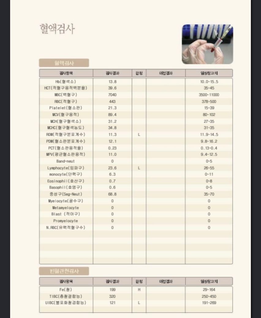 그리고, 사진첨부한 혈액검사도 비정상인 부분들이 나왔는데 걱정하지 않아도 되는지 의사선생님 답변 부탁드립니다.