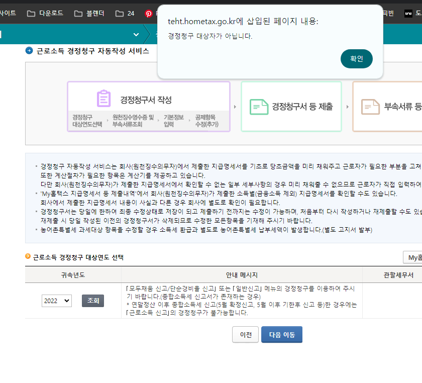 2) 종합소득세 근로소득 경정신고시에 "경정신고 대상자가 아닙니다" (아래 이미지 참고) 라고 뜨며