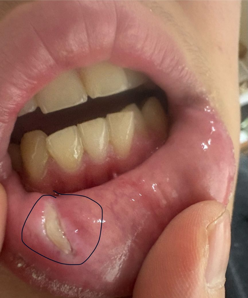 상처가 꽤 깊었나 봅니다. 그냥 놔두셨던 것 같구요. 새살은 차 올라온 상태라고 보여지고 원래의 점막 처럼 보이려면 1주일 정도는 더 필요할 것 같아요. 상처가 좀 깊었어서 점막임에도 좀 시간은 걸리지 않을까 싶어요.