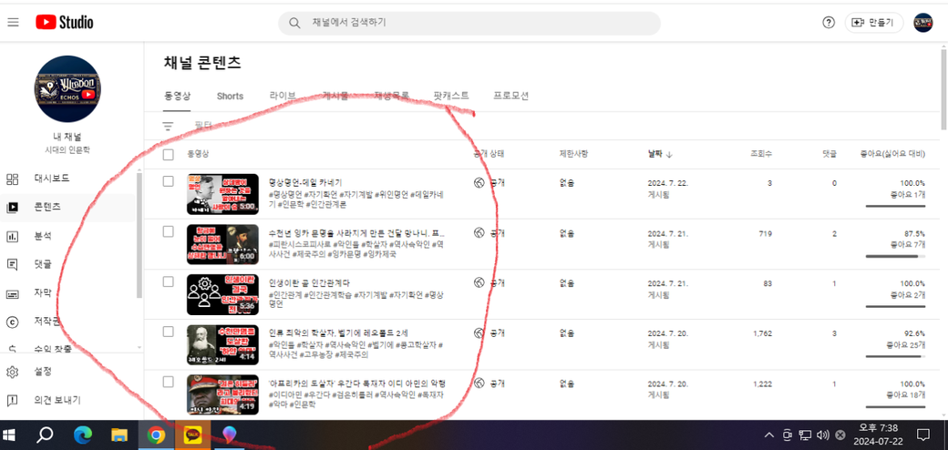 이렇게 채널에서는 영상 올린게 보이는데 유튜브 스튜디오에서는 보이지가 않앙서 수정이고 음악 삽입이고 할수가 없네요. 혹시 무슨 오류인지 해결방법이 있을까요?