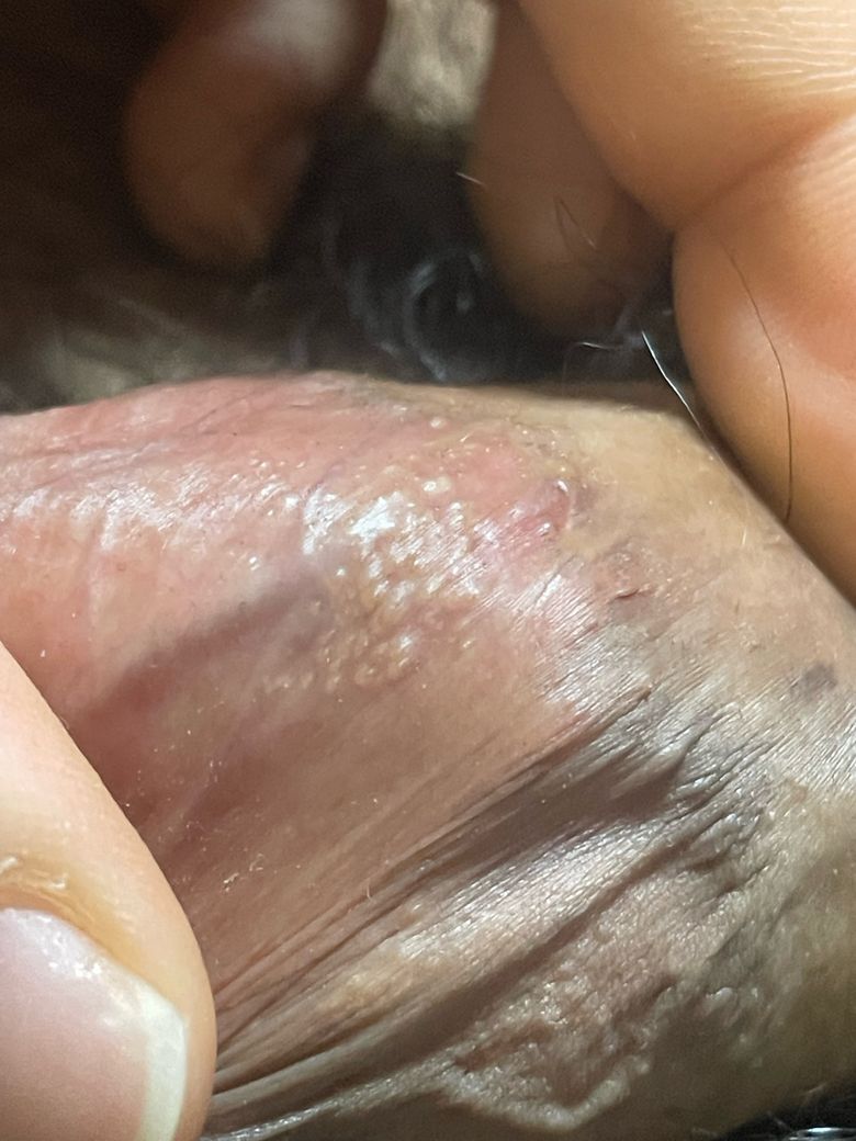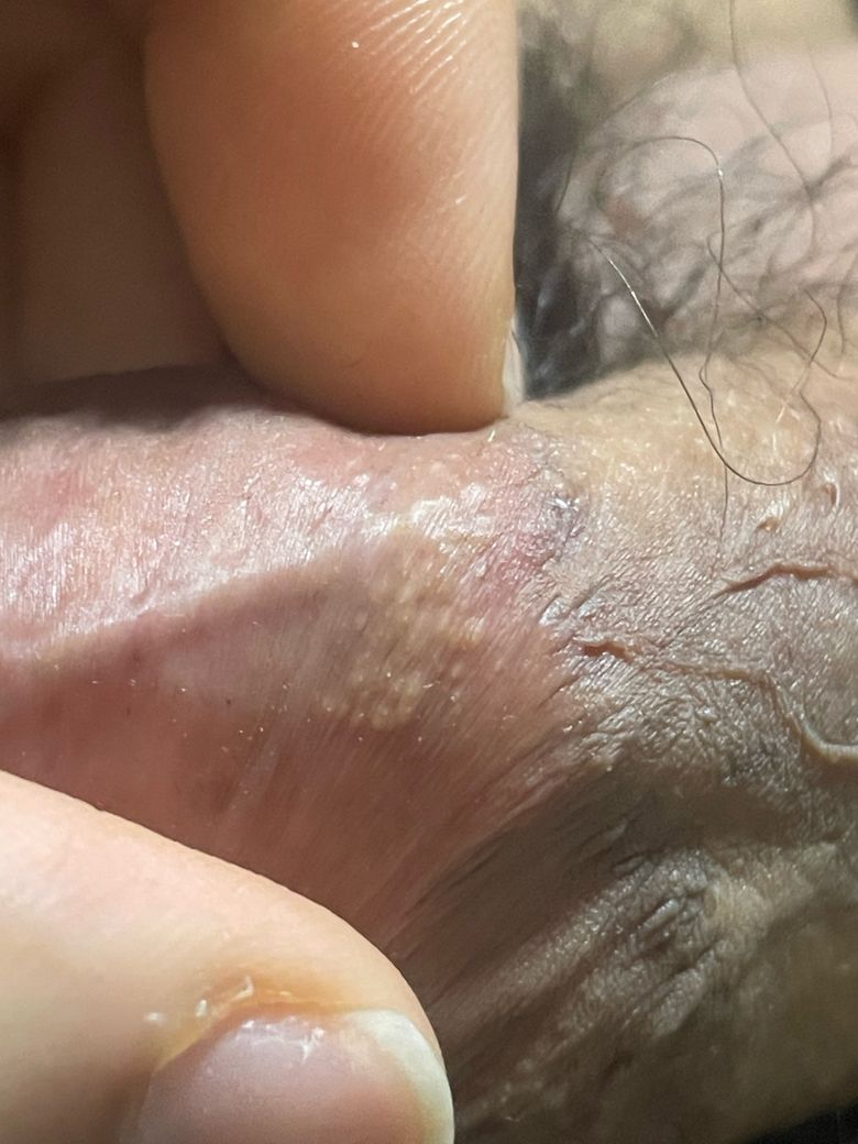 올려주신 사진산 노란빛을 띄고 있는 다발성의 작은 구진성 병변이며 가려움이나 통증이 없다면 포다이스반과 같은 양성 결절 가능성이 높습니다. 성관계로 인해 감염되는 헤르페스 감염은 다양한 형태로 나타날 수 있지만 수포성 병변으로 나타나는 것이 일반적이므로 상기 병변의 가능성은 낮습니다. 이러한 구진성 병변을 제거하기 위해서는 일반적으로 레이져 시술을 고려하게 되므로 이러한 시술이 가능한 피부과나 비뇨의학과 진료를 보시는 것을 권해드립니다.