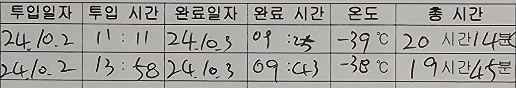 투입시간~완료시간까지의 시간이 총 시간입니다. 두 시간 차이를 계산해보시면 됩니다.