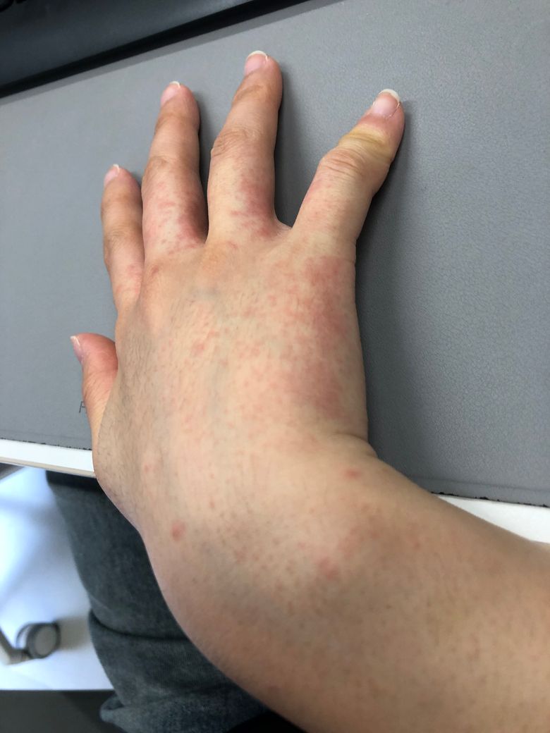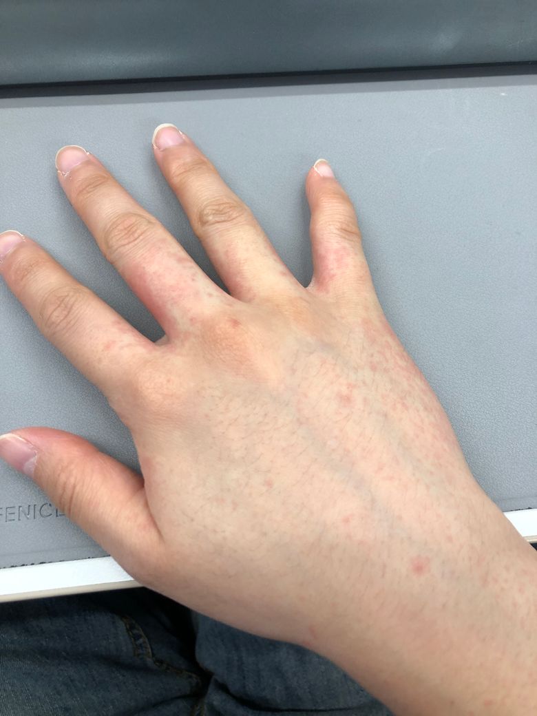 오늘 일어나 손이 너무 간지러워서 보니 이렇게 울긋불긋 붉은 반점처럼 군데군데 빨개져 있습니다. 튀어나와 있진 않아요.