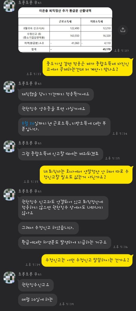 이번에 종합소득세 신고하려다보니 중소기업 청년 소득세 공제 금액이 없어서 전 회사 담당자에게 연락하여 공제 후 변경된 원천징수 영수증을 받았습니다.