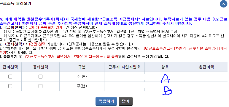 그림과 같이 급여선택/공제선택을 어떻게 체크해야될지 문의 드립니다.