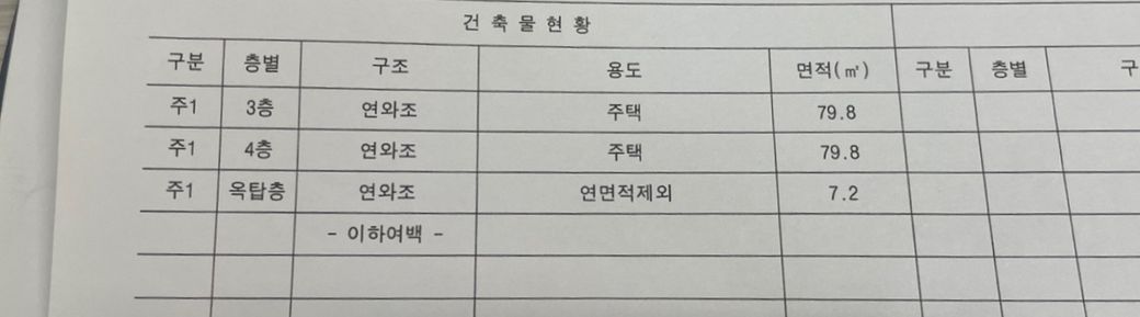 건축물대장 상에 지하 1층/지하 4층의 건물이고 옥탑층은 연면적 7.2제곱미터로 등록되어 있는데, 실제로는 5층에 3세대가 있습니다.(심지어 하나는 투룸)