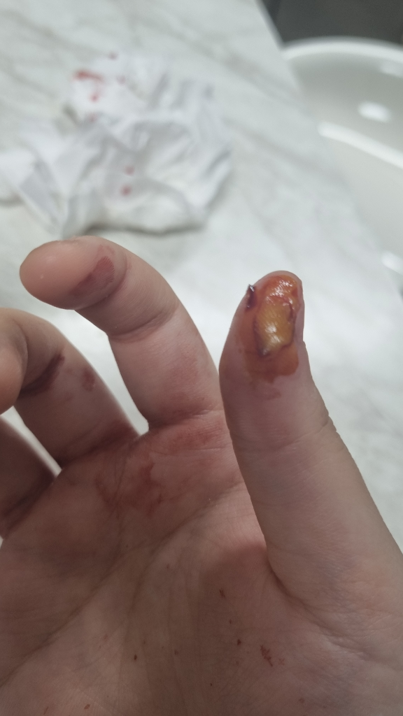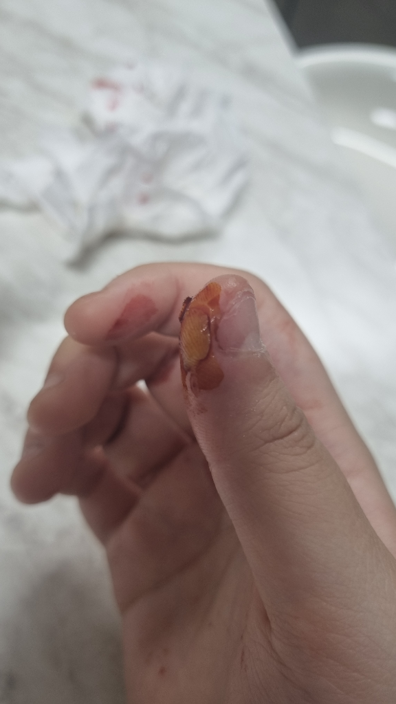 채칼에 베였구요 살점이 덜렁 거려서 꾹눌러 지혈을 했고 20분가령 한 끝에 피가 멈춰서 빨간약을 바르고 지금은 항생제연고와 밴드로 응급처치를 해놓은 상태에요 살점은 조금 많이 나갔고 붙어는 있는 부분이있어서 고대로 있던 자리에 맞춰 밴드로 해둔상태입니다.한 12시간정도 지나니 아프지는 않고 피는 조금씩 나와서 밴드가 더러워질때마다 3시간에 한번씩 갈아줬어요 살점은 되게 뭔가 인조피부처럼 흰색이 되어가는것 같아요 근데 베였을땨보다는 덜렁거리지도 않고 잘 있어요 그자리 고대로.