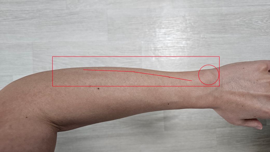 손을 손등쪽으로 90도정도 꺾은 동작입니다. 이 동작을 할 때는 전혀 아프지 않습니다. 다만 여기에 하중이 걸리면 아픕니다. 예를 들어 바닥이나 침대를 짚고 일어날 때 같은 경우죠. 이때 아픈 부위는 팔등쪽에 표시한 부위만 아픕니다. 손바닥쪽에 표시한 부위는 아프지 않습니다.