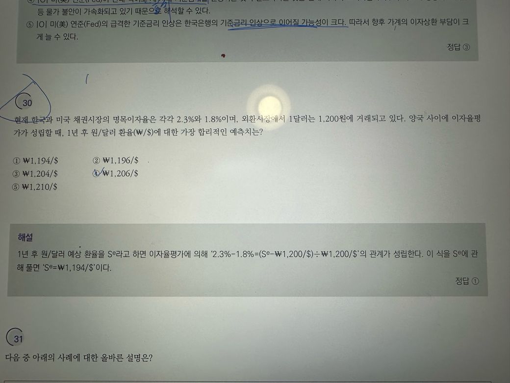 해당 문제의 답안이 잘 못 나온 것 같습니다. 0.5%이기 때문에 -0.5%가 되는 4번 1194원이 아닌 1번 1206원이 정답이 맞습니다.