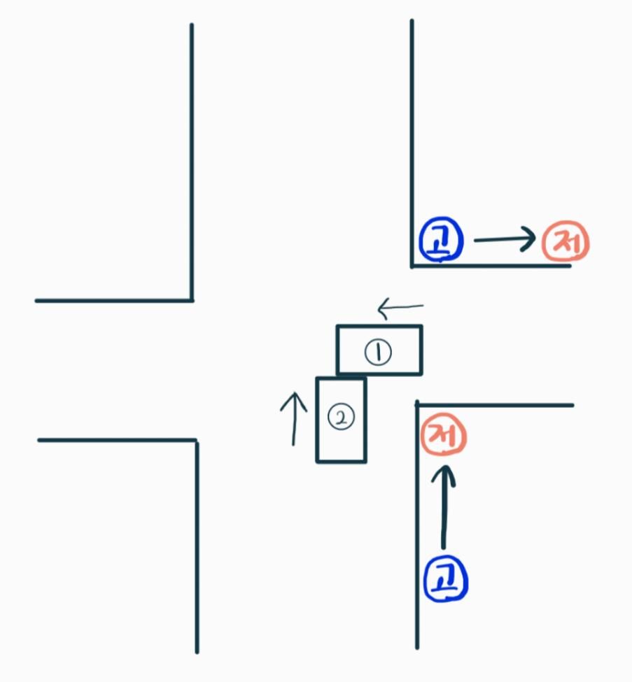 소로 직진 차량(1번)은 낮은 경사 지대에서 높은 경사 지대로 올라가 교차로에 진입하던 상황이었습니다.