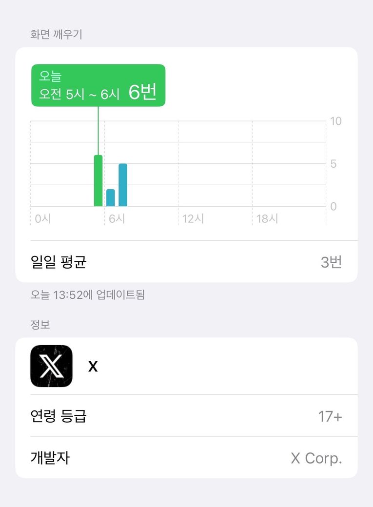 제가 트위터하다가 잠들어서 잠금 열면 바로 트위터가 나왔었는데 저때 새벽 5-6시에 이미 잠들었는데 스크린타임에 다여섯시에 1분의 스크린타임이 있고 6번 화면 깨우기가 있는데 대체 뭘까요..