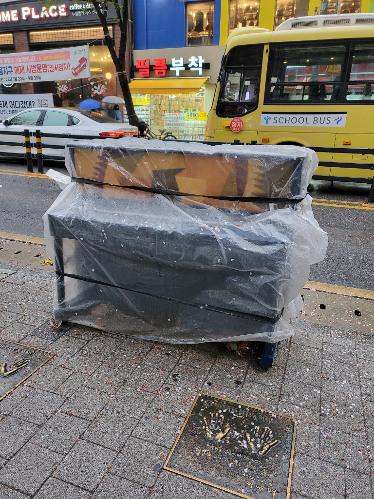 신촌역 1번출구 연세대학교 방면으로 나와보면 이런 피아노가 있는데 비오는 날에 비닐을 덮었다는건 누가 관리 한다는거 잖아요. 신촌역 앞 피아노는 누가 관리하나요?