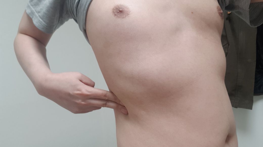 사진은 해당 통증 부위(왼쪽)이며 옆구리에서 갈비뼈 아래쪽으로 방사되기도 합니다.