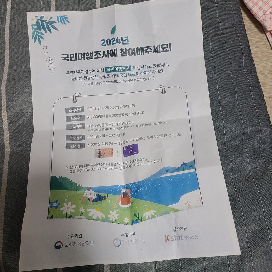 저희 아파트에서는 이런건 해보지는 않았으나 문화체육관광부에서 국민여행조사 했다는 기록이 인터넷에서 뜨긴 하는데 사기는 아닌것 같은데 자세한 확인 여부는 문화체육관광부에 확인여부를 해보시는것이 좋을것 같습니다