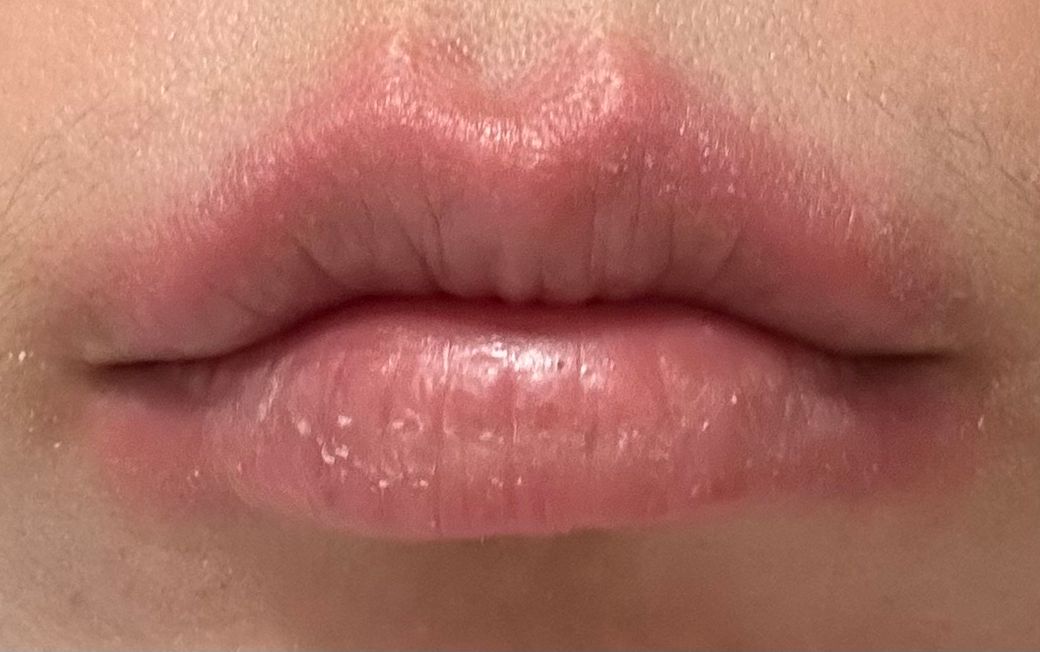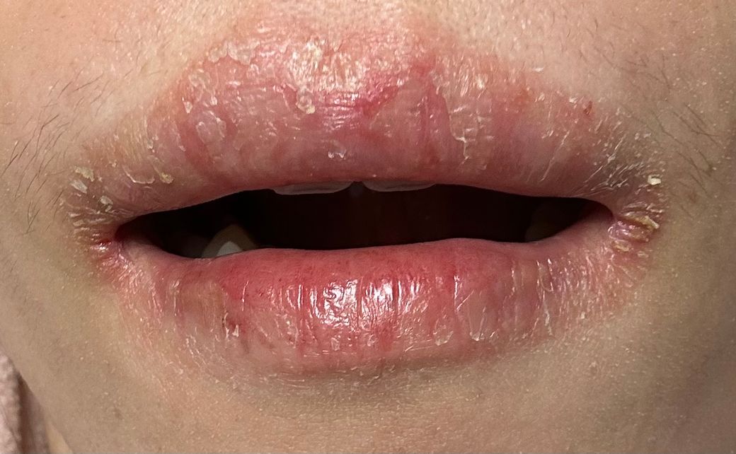처음엔 입술 빨개져 부어 그 다음 노란 진물 터지고 전체입술에 각질 보이는 상태로 전개되어요
