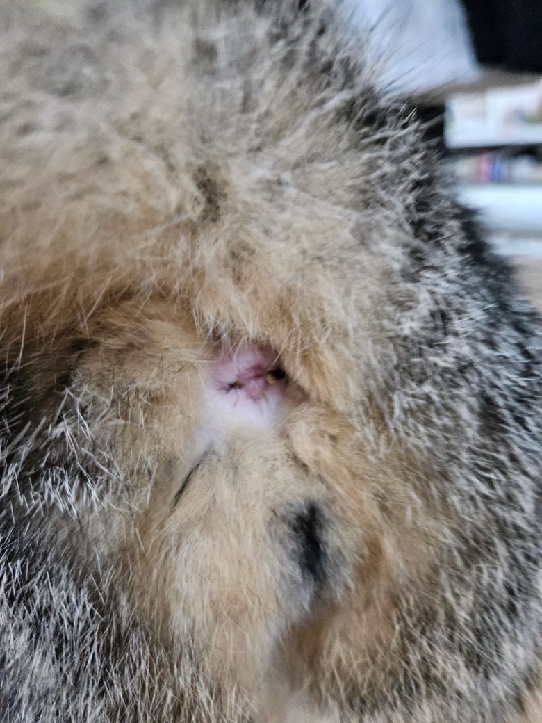 오른쪽 항문낭에 검정색 찌꺼기가 2주 째 붙어있습니다.