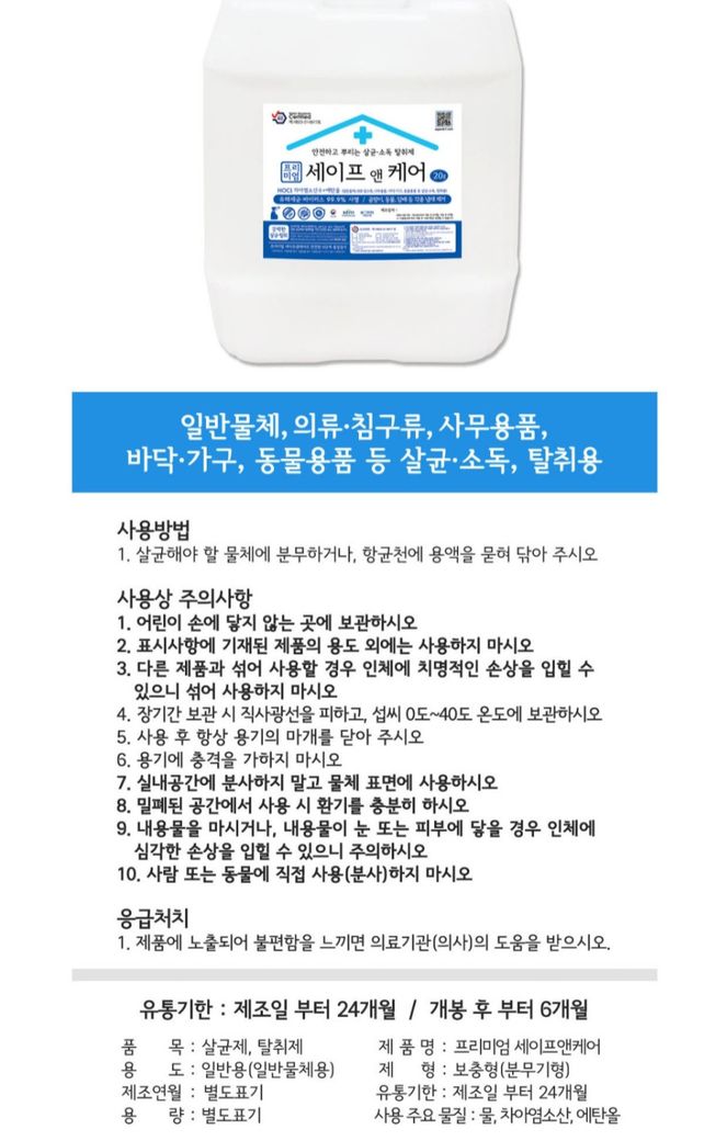 치아염소산과 에탄올이 들어있어 장기 노출시 폐섬유화증이 유도될 수 있어 잦은 환기와 사용제한이 추천됩니다.