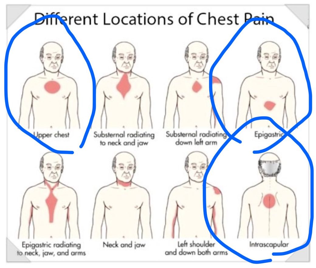 쇄골 아래, 가슴 뼈 중앙, 날개뼈 사이 통증