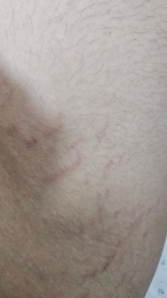 부위를 직접 볼 수 있는 것이 아니라 정확하지 않을 수 있습니다. 만약 대퇴부 내측 서혜부와 가까운 곳에 발생한 것이라면 대퇴부 붉은 튼살(red striae) 가능성이 높습니다. 붉은 튼살은 초기 튼살로 시간이 지나면 하얗게 변할 수 있습니다. 급격하게 살이 찌거나 성장하는 시기에 발생 가능합니다. 외관을 제외하면 무증상인 경우가 많습니다. 통증이나 가려움 발진 등의 특별한 증상이 추가되면 다른 병변일 수도 있으니 그 때 피부과 진료를 보시는게 좋겠습니다. 참고하시기 바랍니다.