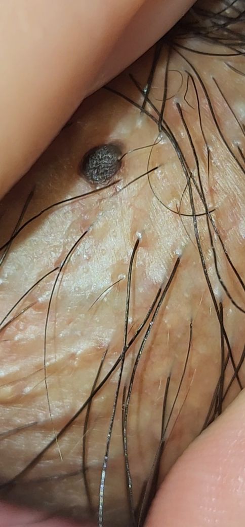 고환과 음낭이 맞닿아 살이 접히는 부분에 돌출형 검은점이 있습니다.