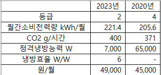 에어컨 구매 시 에너지 효율 등급과 월간 소비 전력량을 함께 고려하는 것이 중요합니다. 2023년 제품은 2등급으로 에너지 효율이 좋고, 냉방 효율이 높아 장기적으로 전기 요금을 절감할 수 있는 장점이 있습니다. 반면, 2020년 제품은 4등급이지만 월간 소비 전력량이 더 낮아 단기적으로는 전기 요금이 덜 나올 수 있습니다. 따라서 에너지 절약과 효율을 우선시한다면 2023년 제품이 유리할 수 있지만, 소비 전력량이 적은 2020년 제품도 상황에 따라 좋은 선택이 될 수 있습니다. 구매 결정 시 용도와 전기 요금 부담을 함께 고려해보세요.