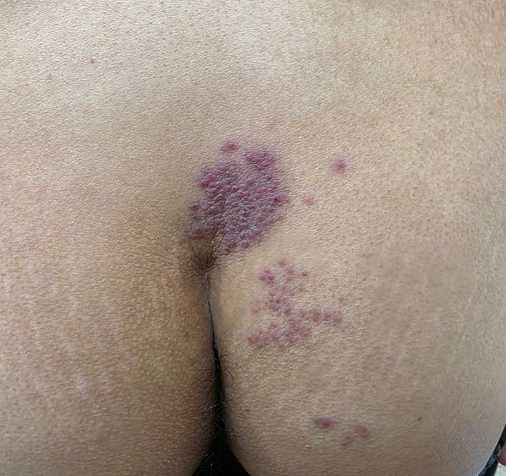 사진상 병변은 한쪽 둔부에 국한되어 있으며, 다수의 작은 수포들이 군집을 이루고 있고 일부는 서로 융합되어 판처럼 보입니다. 또한 인접 부위로 띠 모양으로 확산되는 양상입니다. 이러한 형태는 단순포진보다는 대상포진에 더 합당합니다.