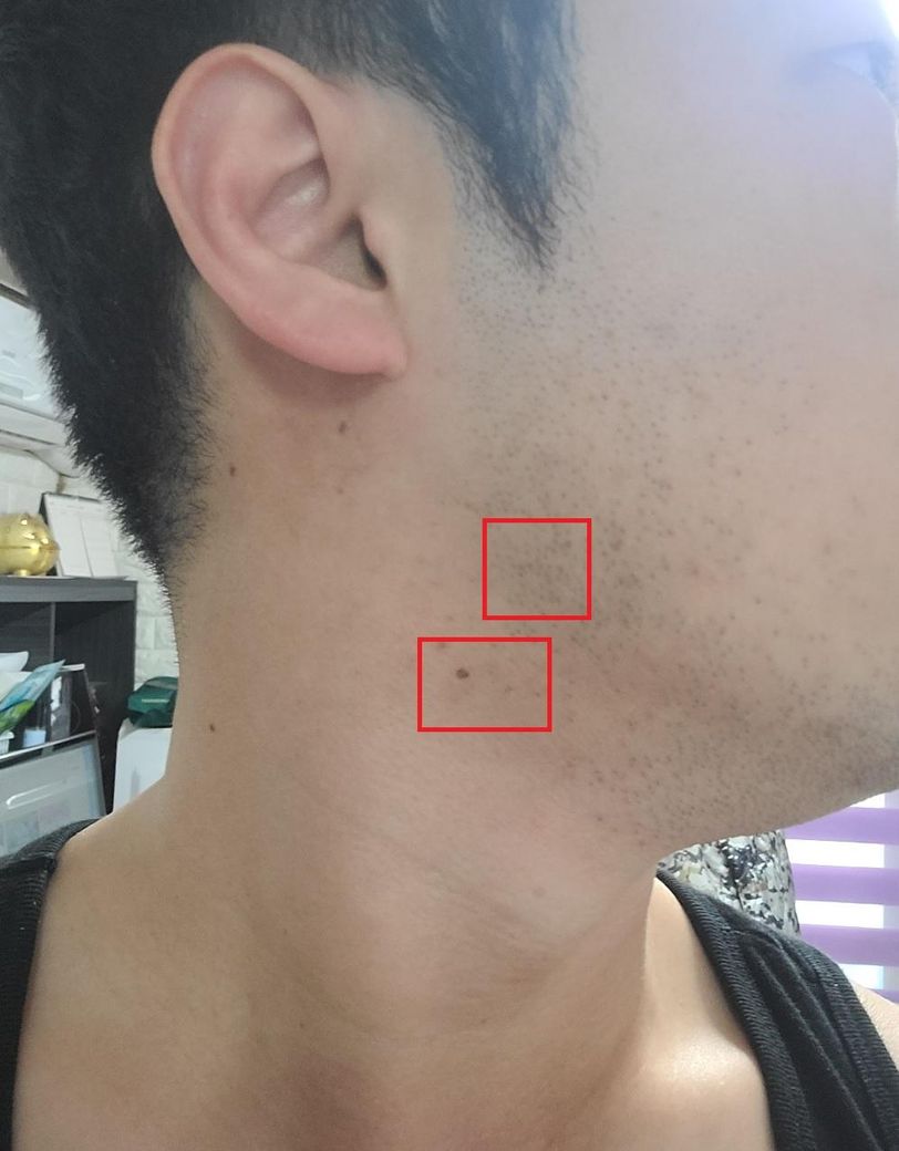 왼쪽 얼굴 사진이구요. 사진을 보시면 위에 1번 네모(아래 턱끝), 아래 2번 네모(아래 턱끝 목위 누르면 푹 들어가는 곳) 통증이 생겨서요.