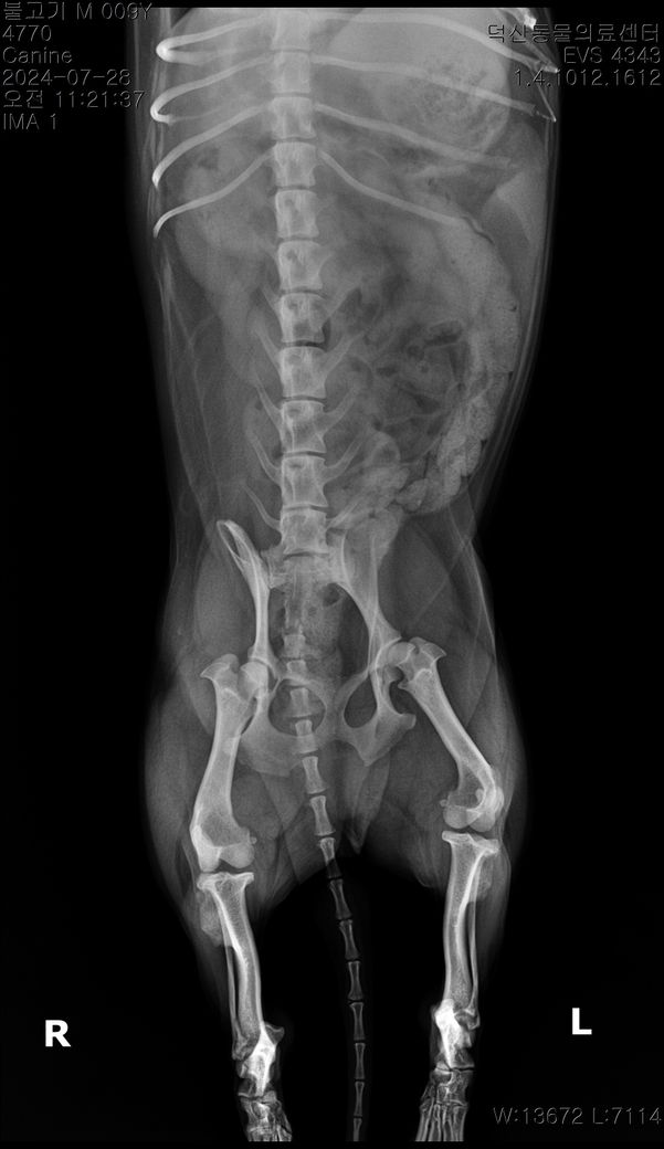 마지막 사진은 촬영할때 환자가 몸을 꼬아서 뒤틀려진 고관절이 찍힌 사진으로 이 사진으로는 고관절 탈구를 평가하면 안됩니다. 앞 사진에서는 탈구가 관찰되지 않고, 특히 연골이형성품종에 해당하는 환자이기 때문에 정상범주가 매우 높습니다. 주치의의 상담을 받으시기 바랍니다.