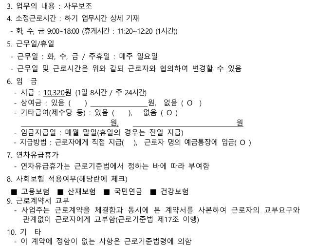 사무보조 아르바이트생이고, 화,수,금요일 9~6시 근무로 계약했어요