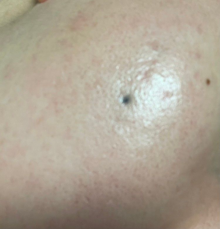 얼굴 볼쪽에 피부밑에 푸른색 점이 있습니다.