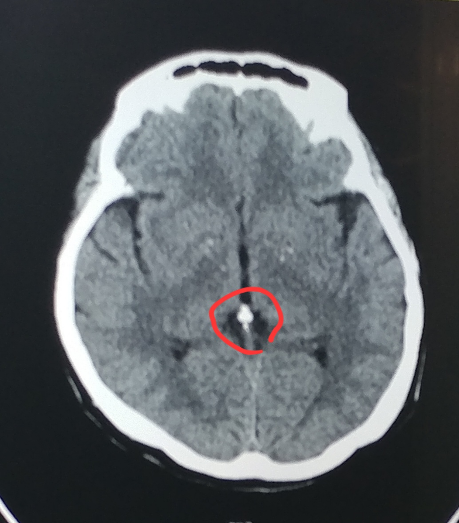 MRI 사진에서도 석회화가 보이기는 하지만 CT에서만큼 분명하게 보이지는 않습니다