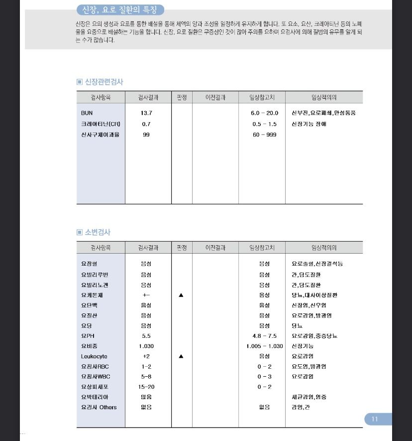 검사 결과지에서 보았을 때에 정상 범위보다 매우 살짝 높거나 낮은 수치들이 존재하지만 특별히 의미를 부여할만한 수치는 없습니다. 매우 양호한 검사 결과로 보입니다. 다만 소변에서 백혈구가 검출되었는데 이는 요로감염을 의심해보아야 하는 결과입니다. 그렇지만 이 또한 여성 분들의 경우에는 소변을 받을 때 쉽게 오염이 되어 나타날 수 있는 소견이기 때문에 요로감염을 의심할만한 증상이 따로 없다면 크게 걱정하실 것 없습니다.
