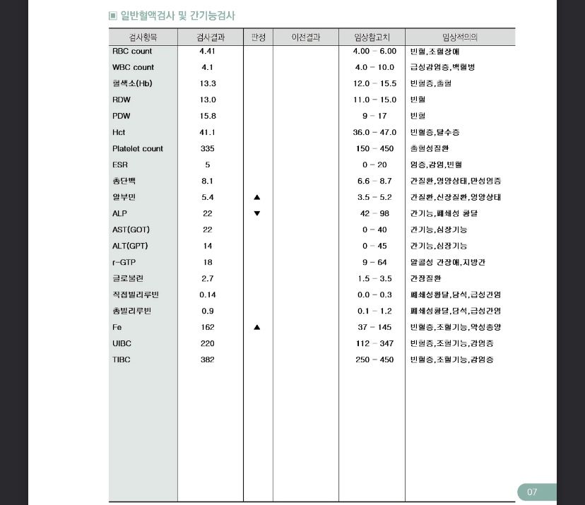 참고로 검진일이 생리 시작 예정일이었고, 검진 이틀 후에 생리 시작했습니다. 아래 글 중에 알부민 alp 등 이상 있는 항목들 해석 부탁드립니다 !