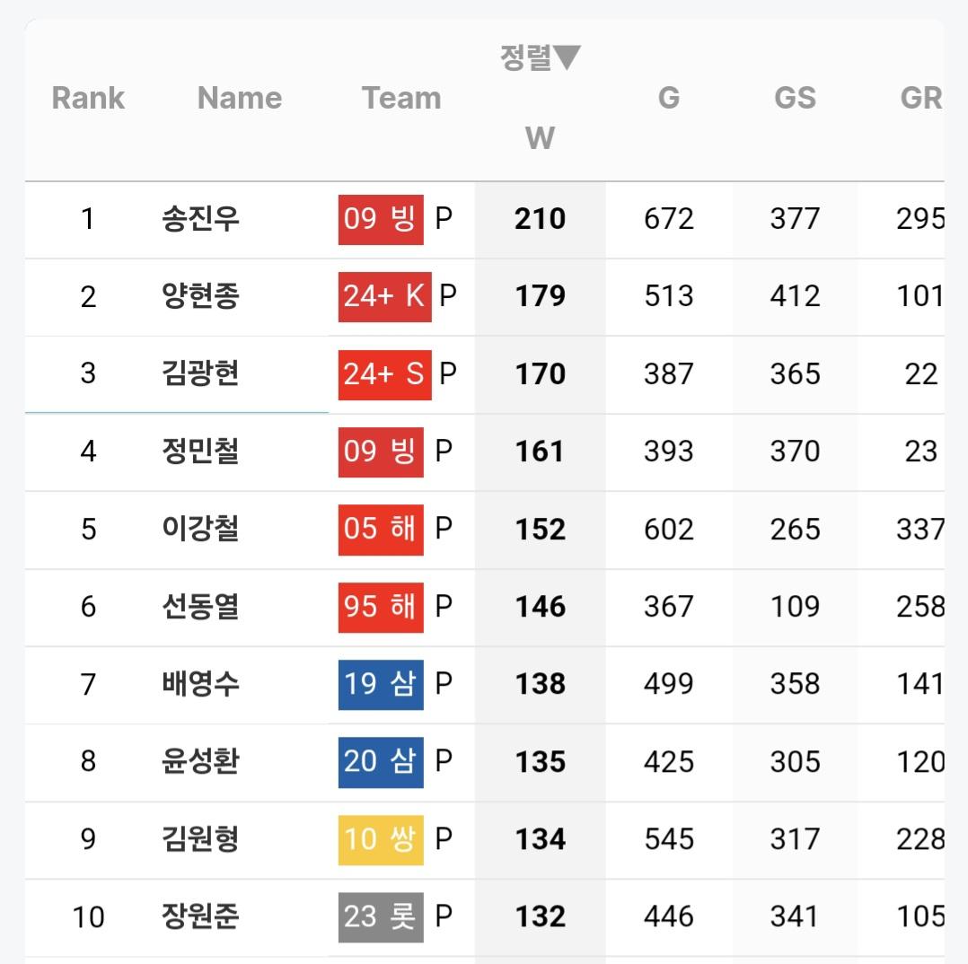 그리고 양현종기아 타이거즈 , 정민철,김광현,이강철 순으로 알고 있습니다