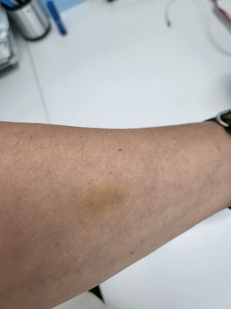 바늘에 찔리면서 혈관벽에 손상이 생기고 피하층으로 누출된 혈액에 의하여 일시적으로 생긴 멍일 가능성이 높아 보입니다. 시간이 경과하면서 서서히 없어질 것으로 사료됩니다.