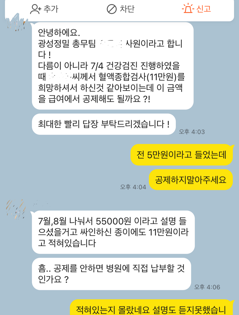 노동청에 민원신고 후 회사측 총무팀사원님에게 카톡이 왔습니다. 급여를 해주신다 하더라구요 단, 퇴사 당일 건강검진을 했는데 그 비용을 공제한 금액으로요.