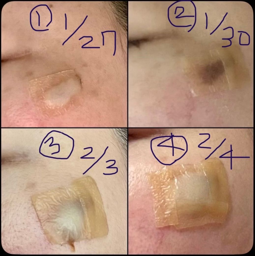 시술 직후 2주 동안 절대 떼지 말라며 듀오덤을 붙어줬어요. 한 10일 정도는 듀오덤이 계속 부풀어도 주위를 덧붙여가며 버텼어요. 그런데 염증이 심한지 심각하게 부풀어 올라 검색해 보니 다른 의사 선생님들은 염증이 심해서 그런거니 교체해주는게 좋다고 해 재빨리 새 듀오덤으로 셀프로 교체했는데 제가 봐도 상태가 안 좋더군요.