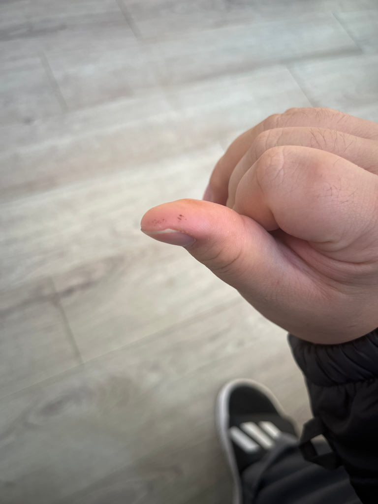 사진의 소견만 놓고 정확한 상태를 알기는 어렵습니다만, 모르는 사이에 미세하게 외상이 생겨서 발생한 점상출혈, 즉, 일종의 멍일 가능성이 있어 보입니다. 경과를 지켜보시고 시간이 경과하여도 사라지지 않는다면 관련하여서 진료 및 검사를 받아보시는 것이 좋겠습니다.
