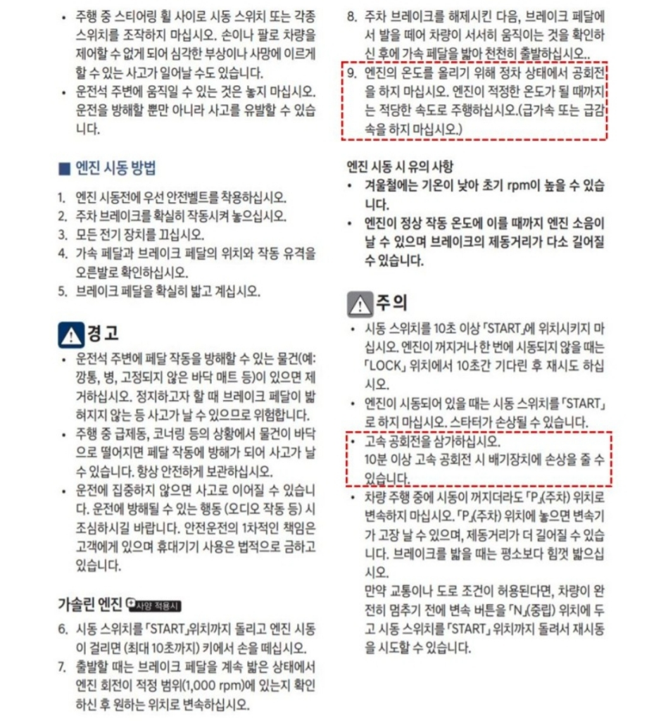 지금은 캬브레타 방식의 차량들이 아니기에 흔히 말하는 예열(공회전)이 필요치 않습니다. 주차 후 가라 앉은 오일이 순환 할 시간 10초 정도 기다린 후 출발하고 냉각수 온도가 적정으로 올라 올때까지 급가속, 급정거 등 고 rpm이 사용되지 않게 적당한 속도로 운행하시면 됩니다. 흔히 운전자가 말하는 예열(공회전)은 하지 말라고 자동차메뉴얼에도 나와 있습니다.