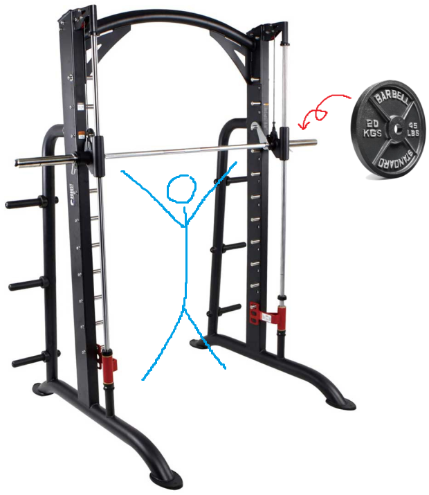 운동을 할 때는 가로로 눞혀진 봉을 잡고 운동하는데요, 그림에서 보시다시피 봉은 양쪽 기둥의 경로를 타고 봉이 수평을 유지한 채 상하로만 움직이게 됩니다.