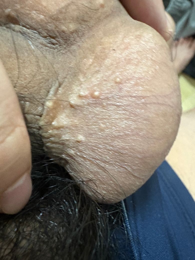 고환 부위에 무언가가 만져지거나 튀어나온 듯한 병변이 생기고, 통증은 없지만 가려움이 있다면 가장 흔한 원인 중 하나는 피지낭종(피지선 낭종, 표피낭종)일 가능성이 높습니다. 이는 피지샘이 막히면서 피지나 각질이 고여 생기는 양성 혹이며, 보통 작고 둥글며, 피부색 또는 약간 흰색을 띠고 손으로 만지면 딱딱하거나 말랑하게 느껴질 수 있어요