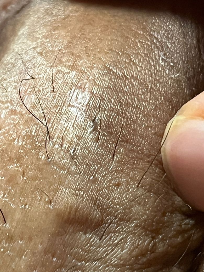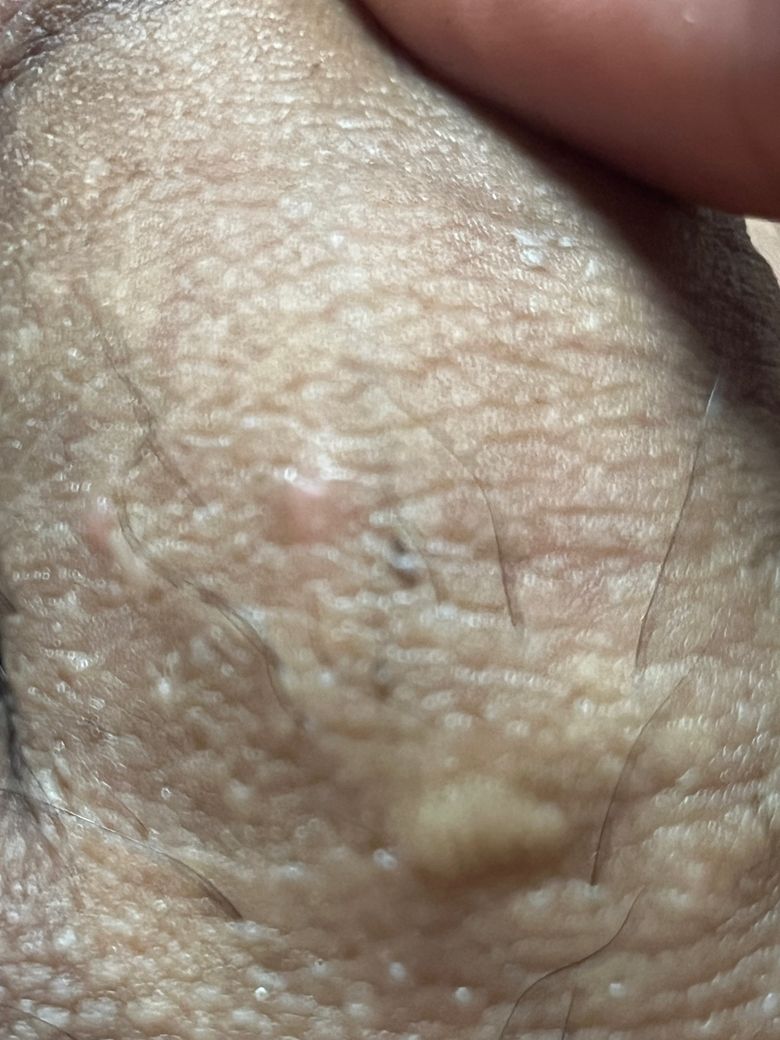 헤르페스나 곤지름 등의 성매개성 질환에서 관찰되는 수포성 병변이나 사마귀 형태의 병변이 아니므로 성매개성 피부 질환으로 보기는 어렵습니다. 작은 구진성 병변으로 진주양 구진과 같은 양성 피부 결절로 판단되며 증상이 없고 크기나 모양 변화가 없다면 별다른 조치 없이 경과 관찰해도 되겠습니다.