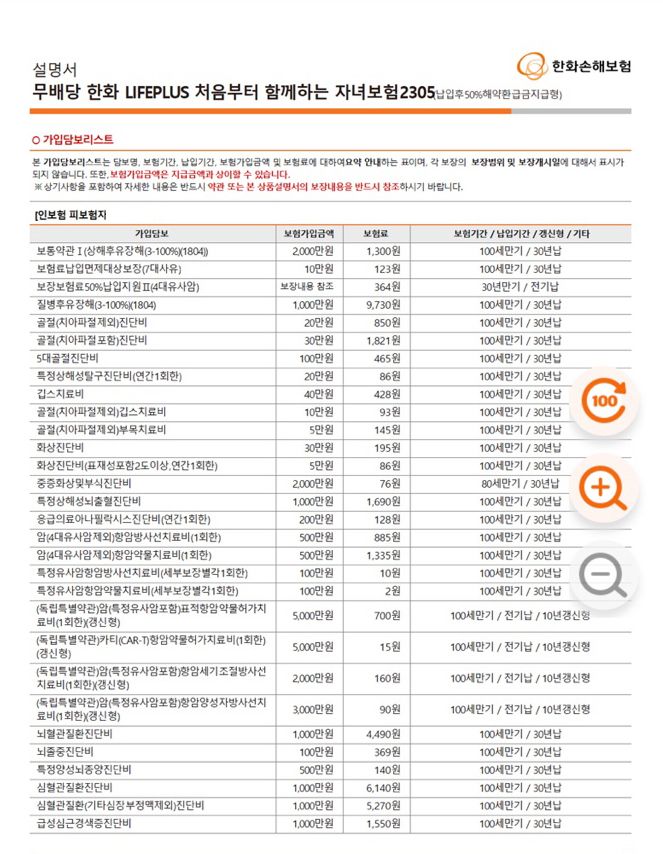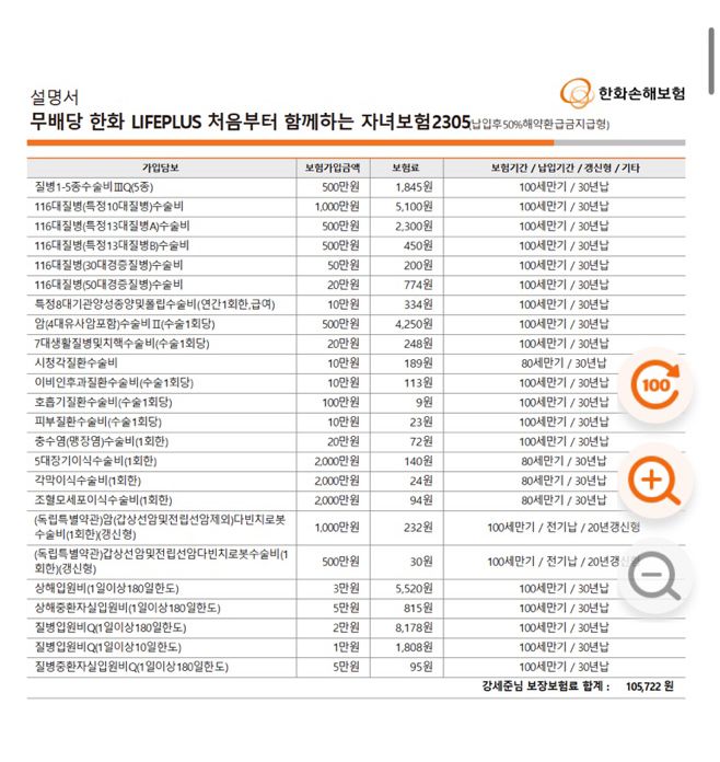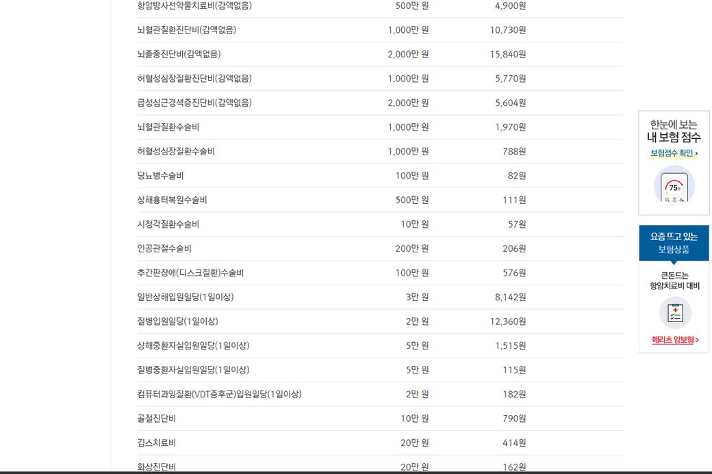 한화손보가 진단비는 많이 저렴한 편이라 메리츠 보험이랑 중복되는 보장 제외하고 가입하시면 훨씬 저렴하게 가입가능할 듯 보입니다.