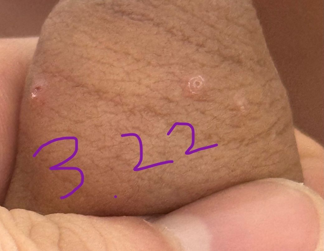 현재 소견만으로는 성병 가능성은 낮습니다. 수포, 통증, 양으 로의 진행이 없다는 점에서 헤르페스나 매독과는 양상이 다르 고, 표면이 거칠게 증식하는 곤지름과도 차이가 있습니다.」