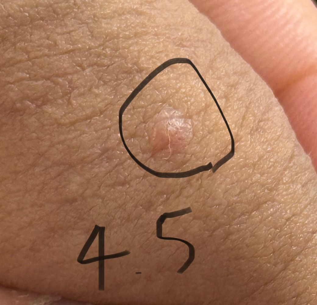 「사진상 중심부에 동그랗게 솟은 병변은 표피낭종이나 막힌 피 지선 가능성이 가장 높습니다. 매끈하게 돌출되고 중앙이 약간 하얗게 보이며 통증이나 가려움이 없는 점이 특징에 부합합니 다. 포경 상태에서는 분비물이 고이면서 일시적으로 더 도드라 져 보일 수 있습니다.