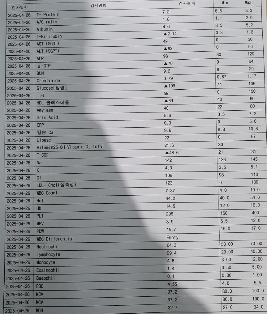 위, 대장 내시경 받았고 위에 상처가 있어서 조직검사를 했고 대장 용종 하나를 제거해서 같이 조직검사를 받았습니다. 그리고 혈액검사 결과도 같이 분석 부탁드립니다. 병원에서는 별 말씀을 안 하시던데 T빌리루빈 수치가 많이 높아보이고 T-C02는 무슨 수치인지 알려주세요 상 복부 초음파도 실시했는데 문제점은 없었습니다. 순서는 내시경 받고 나서 혈액검사 받았습니다.