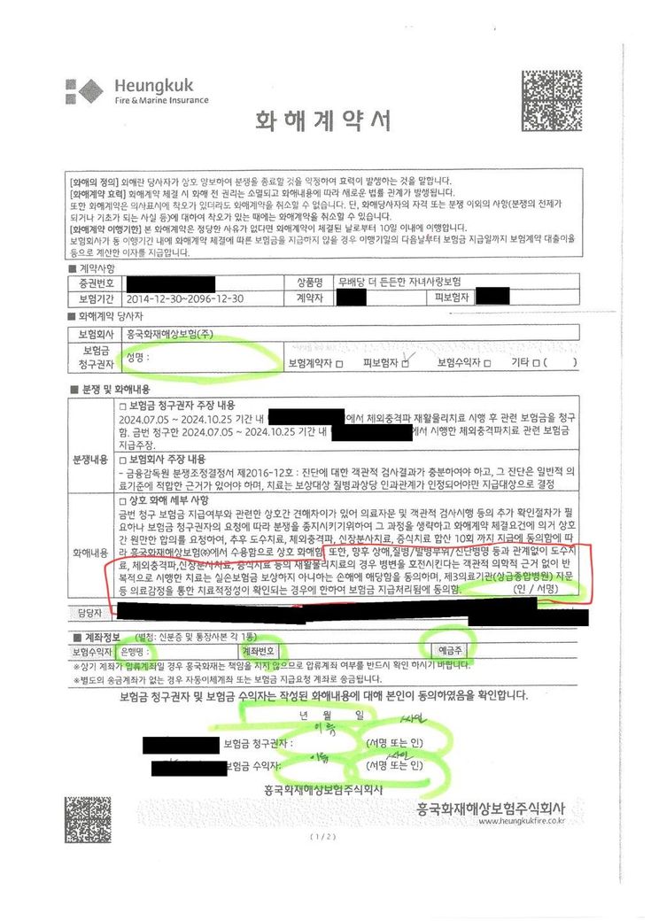 손해사정사분과 만남을 가지고 이후 무릎 비급여 치료는 안받을거 같다 말씀드리고 의료자문동의서만 사인 안하고 2주 뒤에 화해계약서 서류를 받게 되었는데 앞에 무릎건은 마무리단계라 치료 10번 제한은 상관없었는데 빨간 표시 안에 내용이 너무 신경쓰입니다. (이번건은 약관대로 보상 해줍니다.)